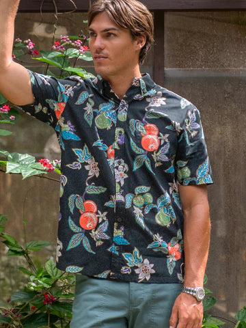A vibrant tribute to the beloved local Hawai'i blend of passion orange guava juice. Made from our signature 100% cotton broadcloth, this aloha shirt features hand illustrations of passionfruit, oranges, and guava fruit—a visual treat that reflects the flavors of Hawai'i.